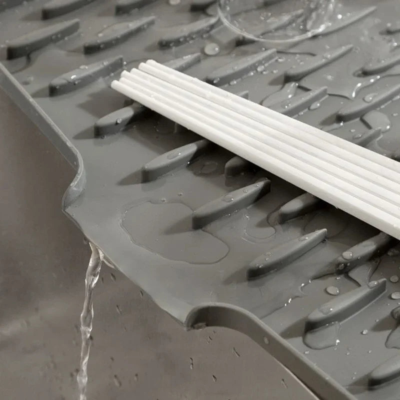 The AquaMat™ Silicone Drain Pad Drying Mat is a smart kitchen essential designed to drain water efficiently while protecting your countertop. Made from high-quality, heat-resistant silicone, it features raised grooves that allow water to flow away quickly—keeping dishes dry and surfaces clean.